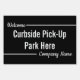 This lawn sign is black and white. Edit text to meet your needs. The current display text says 'Welcome' in a small white script at the top. In the center, there's large display text that currently reads 'Curbside Pick-Up Park Here'. At the bottom, there's a small white script for a custom message such as your company name.
