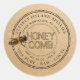 Design features a realistic honeybee just on the edge of the sticker, as if she's wandering over to investigate. Personalize with your business name, address, honeyomb net weight. Kraft background with dotted border.