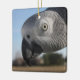 In your face African Gray parrot picture with a nature scene background. A closeup of the pretty eyes and feathers of a Gray.