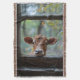A curious brown cow gazes through a weathered wooden window, evoking feelings of nature and rural charm, framed by greenery and a tranquil rustic backdrop.