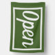 Open sign flag. Simple white on green flag using a cursive font and a white border.