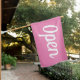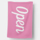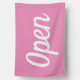Open sign flag. Simple white on pink flag using a cursive font,