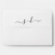 Cursive script initials geometric liner wedding envelope. It showcases a black and white geometric pattern on the inside and and your initials on the flap in cursive script handwritten calligraphy.