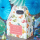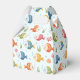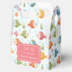 This personalized favor box features smiling tropical fish in vivid shades of red, blue, green, yellow, and orange, swimming among seaweed, coral, and bubbles, set against a soft light blue background.