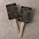 These curved branches wooden wedding program fans are perfect for a modern wedding. The country chic design features the silhouette of two floral branches arranged to compose a rustic leafy wreath on a wood background. Include the name of the bride and groom, the wedding date and location, thank you message, order of service, and bridal party. Order your programs assembled or non-assembled.