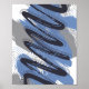The artwork is an abstract composition featuring bold black brushstrokes arranged in slanted, curved repetitions, resembling flowing waves or large connected letters. Behind these strokes, irregular patches of blue and gray create layered depth, while thin curved lines in black and gray spread across the white background. The overall impression conveys dynamic movement and a sense of continuous energy, as if symbolizing crashing waves or powerful flowing forces in an abstract form.