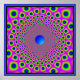 In this two-dimensional image the arrangement of the lines and the design give the perception of a curved space, with a floating sphere. The colors in this image are not "web safe" and therefore look washed out on the monitor.