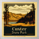 This poster captures the beauty of Custer State Park in South Dakota. The park is home to towering granite peaks, crystal-clear mountain lakes, and lush pine forests. Visitors can hike, bike, camp, fish, swim, and explore the park's many wonders.The image is rendered in a vintage style that evokes the early days of national park tourism.