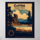This poster captures the beauty of Custer State Park in South Dakota. The park is home to towering granite peaks, crystal-clear mountain lakes, and lush pine forests. Visitors can hike, bike, camp, fish, swim, and explore the park's many wonders.The image is rendered in a vintage style that evokes the early days of national park tourism.
