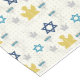 Hanukkah table runner with traditional symbols of angels, menorahs, and the Star of David. To add interest to the background, faded small squares and curved branches were added.