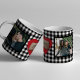 Personalized modern coffee mug with your 2 photos and a red heart with wooden engraved monogram initials and text over a black and white gingham plaid pattern. Cute Valentine's Day keepsake gift for boyfriend or girlfriend, couple dating relationship anniversary, wedding or engagement.