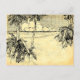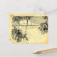 A custom return address postcard with a vintage etching of palm trees on a sandy beach and beautiful clouds over calm ocean waves, on a faux parchment background.