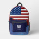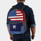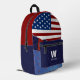 This design features American flag and map pattern with red blue and white stripes. Custom American flag monogrammed name backpack in high quality. This design can be easily edited. If you need help with the customization please message me via Zazzle.