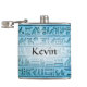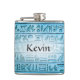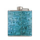 A cool blue liquor flask with lines of ancient hieroglyphs engraved on stone, with the option of personalizing it with the name of your choice.