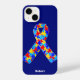 Custom Autism awareness ribbon iPhone 14 case for autistic friends or family. A cool proud autism mom or dad gift that can be personalized with any text below the puzzle piece ribbon of blue, yellow, and red. A neat Asperger Syndrome pride present.