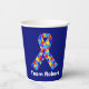 Custom Autism awareness ribbon paper cup for autistic friends or family. A cool proud autism mom or dad design that can be personalized with any text below the puzzle piece ribbon of blue, yellow, and red for your fundraiser or awareness walk.