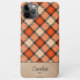 Contemporary tan beige, taupe brown, black, and autumn pumpkin orange colored tartan plaid, and a faux leather texture pattern background. With room to customize or personalize with a name monogram or initial of your choice. Beautiful, modern, and cool cover for the trend-savvy and art-loving hip trendsetter, artsy motif lover who wants to protect their phone from dust and dirt, wear and tear. This design is available in Apple iPhone 6, 7, and 8 Plus, 10 or X, XR, XS, 11, 12, 13, 14 Mini, 15 Plus, and Pro Max cellphone cases. Show off your personal style, look fashionable and trendy, and feel stylish with a unique design on a mobile device accessory of your choice.