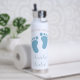 Celebrate a new arrival with this sweet custom water bottle, featuring soft blue baby footprints and a “See You Soon” message. Personalize it with any name — perfect for excited aunties, grandparents, or baby shower guests. A meaningful keepsake for gender reveals, birth announcements, or hospital visits.