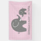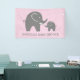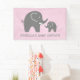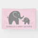 Custom baby shower banner sign with grey elephants. Indoor and outdoor quality. Elegant personalized pink and white polka dots pattern. Cute design with zoo animal illustration. Whimsical typography. Available in different sizes for inside and outside. Small medium and large shapes. With or without holes and hooks. Pink and white or customizable background color. Add name to the template. Babyshower accessories with gray calf. Polkadot print background. Gender neutral design for girl or boy.