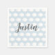 Custom baby shower party napkins with cute sheep pattern. Custom paper cocktail napkins with farm animal print and name of newborn child. Stylish cocktail hour, lunch or dinner napkins with elegant handlettered script calligraphy typography. Pretty party supplies for new baby boy or girl. Handwritten style font with vintage look. Change quantity to get the cheap bulk discount price. Beautiful celebration accessories for new mommy and daddy. Pastel blue, pink or custom color.