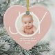 This stylish heart-shaped Baby's First Christmas Photo Ornament is decorated with the word JOY in white on a pink background.
