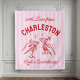 Set the vibe! Fun “With Love From” custom destination tapestry with clinking martini glasses, the perfect backdrop for bachelorette photos, bridal suite décor and party keepsake.