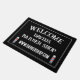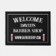 Custom barber shop doormat with red and blue barber pole sign. Personalize with your own business / company name. Black and white door mat.