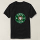 Custom barista t shirts for cafe or coffee lover. Personalized dark tee with business name or funny quote. Also available on sweaters and hoodies. Create outfits for boss, co worker, friends, family, mom, sister, employee, co worker, staff, shop personnel etc. Customizable template with cup and coffee beans logo. Green and brown colors.