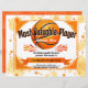 Add your award title such as summer camp MVP player, Most valuable player, most improved, team name and date to this beautiful custom printed award certificate for a summer camp, team league, or championship tournament. Makes a great player of the month or year, completion, recognition, achievement, accomplishment, or sports banquet award. Custom personalized award plaque with colorful orange basketball theme is easily customized online with no minimum order quantity. Full color printing and background with custom prompted generative ai graphics. Great for boys or girls youth, teen, kids or adult summer camp, regular season, tournament, championship sports league team or any desired purpose, with no minimum order quantity and no setup fees.