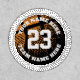 Custom basketball ball patch with jersey number. Custom color Velcro and iron-on patch. Add your own personalized text and sports jersey number. Great for sticking on sportswear, team uniforms, clothing, shoes, caps, bags and more. Personalized patches in different shapes and colored stitching. Round orange example. Background can be changed too. Suitable for kids and adults.