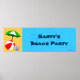 A custom party or room poster with blue retro letters and art of a beach ball, pool umbrella and other swimming or tanning essentials.