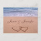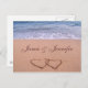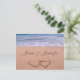 Custom "save the date" or "engagement" card with two hearts drawn in the sand and blue ocean background. Easily change to your names for your special event.