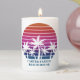 Cute custom beach sunset candle for a destination wedding or family island home near the ocean. Cool personalized favor or gift featuring tropical palm tree and pretty pink and blue.