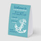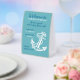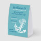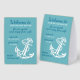 This modern and stylish paper tent sign features a vintage anchor illustration along with the message: "Welcome to our beach house! Be our guest and enjoy free Wi-Fi. Network: [your network name] - Password: [your password]. Enjoy your stay!" The text is in teal blue and white, against a seafoam green background. You can also personalize or customize it with your own message. It's a simple and welcoming way to inform your vacation rental guests about the internet login details.