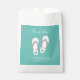 Cute beach wedding thank you party favor bags for tropical destination marriage, baby shower, summer birthday, bridal shower, celebration, exotic anniversary, engagement, marriage etc. Personalized DIY party supplies with custom color background ie turquoise blue. Add your own name, date and custom thank you for coming message. Classy script typography template with beach flip flops artwork. Hand out sweets, candy, homemade pastries, selfmade fudge, donuts, cakes, treats and other fingerfood for guests. Available in white, ecru and beige kraft paper. Bulk pack offer. Also nice for food event, shop, bakery store, business, company etc. Trendy gift bags with heart slippers / sandals design. Great for food or non food products.