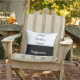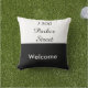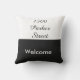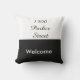 The Custom Black and White Street Address Welcome Outdoor Throw Pillow has a white half on top with black text. The bottom has white text on a black background. Personalize house number (street address) and message with your desired text. Perfect for a front porch.