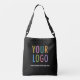 Easily personalize this all-over-print black crossbody tote bag with your own business logo and promotional text. This design accommodates double sided printing. The dimensions of the medium crossbody bag are 16 inch x 16 inch with 43 inch adjustable strap. Also available in large size and shoulder tote style. No minimum order quantity and no setup fee. Made in USA.