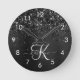 Easily personalize this trendy elegant round clock design featuring pretty black sparkling glitter on a black brushed metallic background.