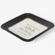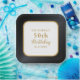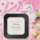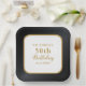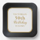 Black, white and gold square paper plates for a 50th birthday party. This template design allows to personalize them with the birthday lady's name, milestone and a date.