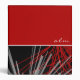 Modern three (3) ring binder features a stylish organic abstract design in a black and white color palette with red accents. The top half the features a simple plain red background with monogram initials presented in a modern script in lower case. The bottom half features the white and gray ribbons with red accents on a black background.