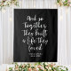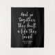 Black and white wedding backdrop with the quote "and so together they built a life they loved". Ceremony or reception party decor personalized with the couple's names and the event date.