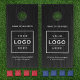 A dramatic, high-contrast look for your brand — this custom business logo cornhole set features a black wood grain background with white text. Both boards display your company name above a clean logo placeholder, with space for your location, slogan, or website below. Upload your logo in any color or shape and customize all text fields. Cornhole bag colors shown are blue and red and can be modified. A bold branded yard game for corporate picnics, team building events, trade shows, and company parties.