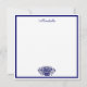 Custom square note cards with elegant script letters and vintage woodcut art of a basket of flowers in blue and white and a simple blue border on the front and a grey back.