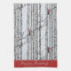 This modern kitchen towel features hand-drawn birch trees with red Cardinal birds perched on branches in black ink, with shading done in cross-hatch style, against an elegant very light blue background. Personalize with you favorite Holiday greeting, a name, or a Family name.