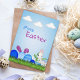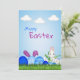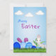 Blue easter eggs amid green grass on a blue background suggest the bright colors of spring. Customize the text in the foreground as well as in the background.
