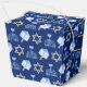 Beautiful Hanukkah party fortune favor box in pretty blue with a cool pattern of Judaism star, dreidel for fun Chanukah games, and the Jewish menorah for the holiday. Monogram with your own gift message from your family.
