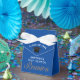 This modern custom high school reunion party favor box features the high school alumni name in white script on a blue background for a 10th, 20th, or 30th celebration.