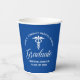 This custom blue medical school graduation party paper cup features classy white typography under a medical caduceus and your college name for the class of 2025. Customize with your graduating year under the elegant calligraphy for great personalized university graduate decor for a nurse or doctor.