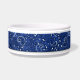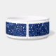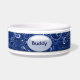 Stylish dog food dish, with a light and dark blue paisley pattern band, around the white ceramic dish. Graphics of a shinny looking light blue oval, on the front, has dark blue custom text ready to personalize. Very handsome pet dish that will brighten your kitchen. Makes a great gift idea for any dog owner.