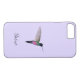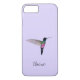 This custom phone case is featuring a Blue-throated Starfrontlet Hummingbird on a light purple background. The font style and size can be changed by clicking on "customize further".